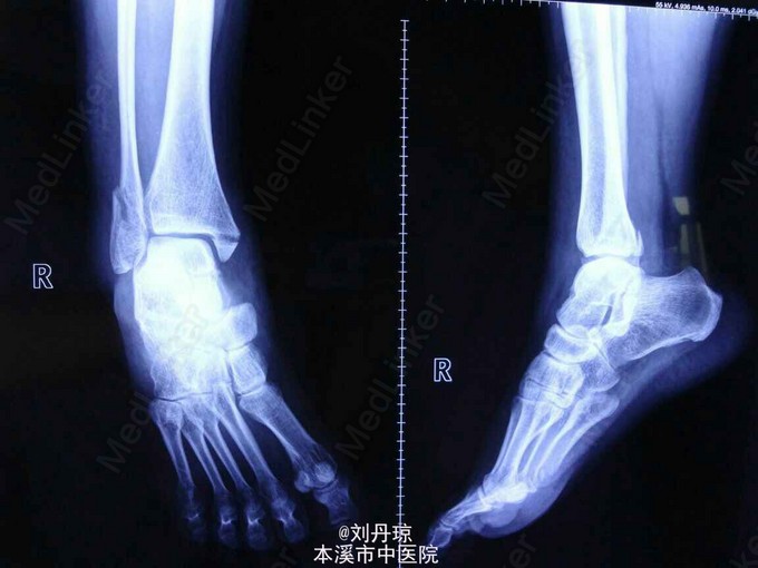 查体:患者生命体征正常,踝关节肿胀、畸形,内、外、后踝压痛阳性,有骨擦感,右踝关节功能障碍。 辅查:旋后外旋型踝关节骨折脱位