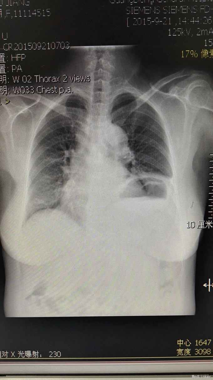 查体:胸廓无畸形,双肺闻及较多干、湿罗音,双侧呼吸运动基本对称,幅度稍有减少,心腹体查未见异常,双下肢无水肿。 辅助检查:外院胃镜:慢性萎缩性胃炎。CT:左侧横膈抬高,未见报告。X线如图
