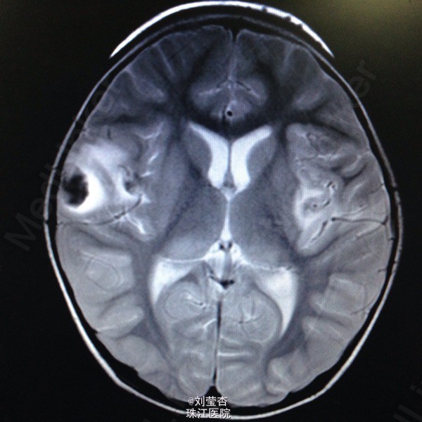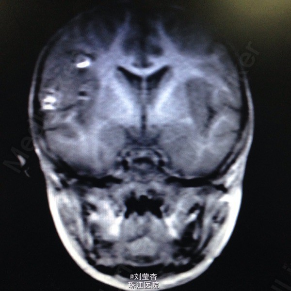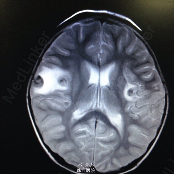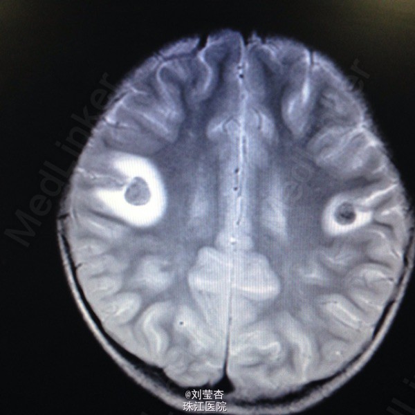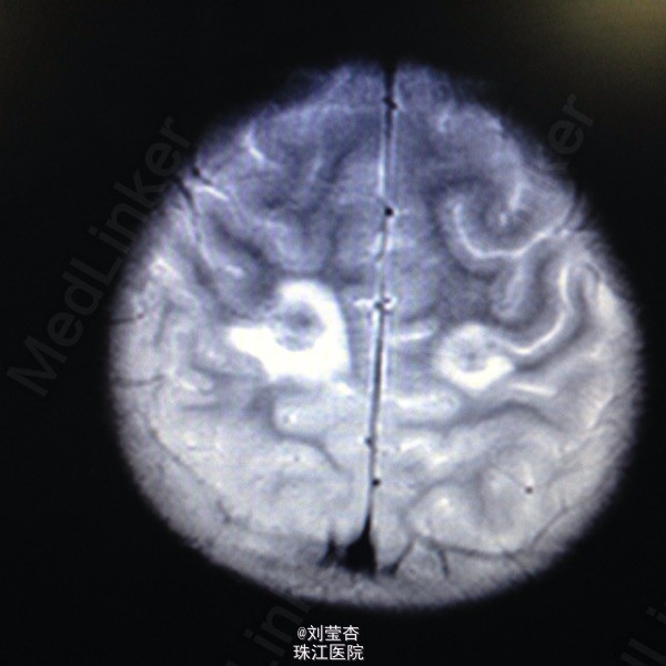 患儿女,3岁,因“咳嗽、流涕6天,发热5天,抽搐1次”入院。患儿接触家猫后出现流清涕,伴咳嗽,为间断单声咳,2天后出现发热,热峰39.5℃,予退热处理,患儿仍有反复发热,后患儿出现双眼向中上方凝视,双眼眼周肌肉抽动,伴口角流涎,无伴口周发绀、牙关紧闭,神志清楚,呼之可应,体温不详,四肢末梢温暖,四肢肌张力不高,持续约1分钟后可自行缓解。到当地医院就诊,查血常规:白细胞10.8G/L,中性粒细胞66.1%,淋巴细胞百分数27.1%,血红蛋白110g/L,血小板272 G/L,CRP4.2mg/L;胸片示支气管炎;头颅CT示右侧颞叶、双额叶多发散在脑出血。予吸氧、退热、抗感染、抗炎、补液、降颅压、止血等处理,患儿未再出现抽搐,患儿仍有反复发热,家属要求转我院进一步治疗。