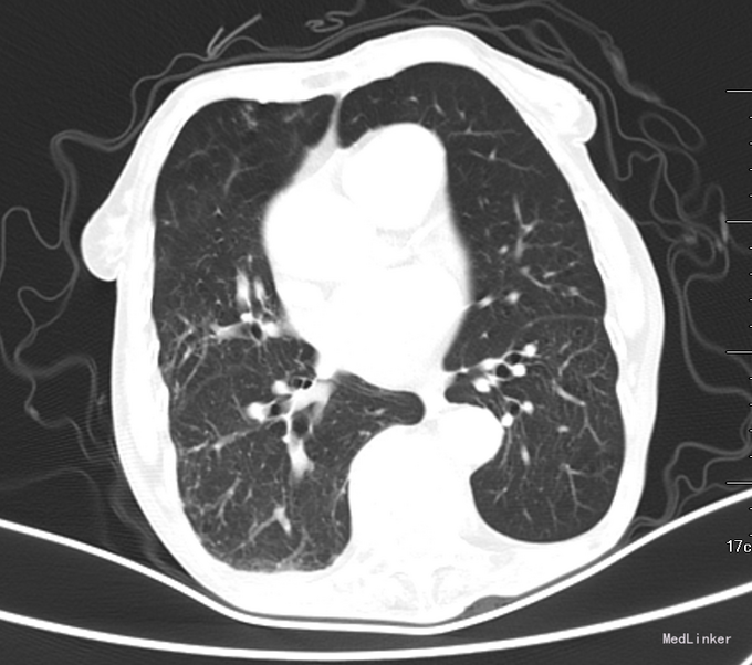 查体:T37.2℃,P72次/分,R18次/分,BP145/77mmHg。神清语明,平车推入病房,查体合作。全身皮肤及巩膜无黄染,睑结膜无苍白。颈静脉无充盈,未触及锁骨上淋巴结,听诊双肺呼吸音清,未闻及明显干湿罗音。心音纯,律齐,剑突下可见心尖搏动,各瓣膜区未闻及病理性杂音。腹软,肝脾肋下未触及,腹部无压痛及反跳痛,双侧输尿管区无压痛,肝区肾区无叩痛,移动性浊音阴性,双下肢无水肿。腱反射正常,病理反射未引出。 辅助检查:2015-07市中心医院胸部CT:双肺气肿,考虑双肺感染性病变,双侧胸腔少量积液,冠状动脉钙化。:CRP:15.6mg/L;结核抗体测定:结核抗体 弱阳性;血清离子:钾 3.85mmol/L;钠 145.5mmol/L;氯 108.2mmol/L;钙 2.14mmol/L;血常规+BG:白细胞计数 3.910^9/L;中性粒细胞百分比 56.4%;血小板计数 21910^9/L; T-SPOT:阳性。
