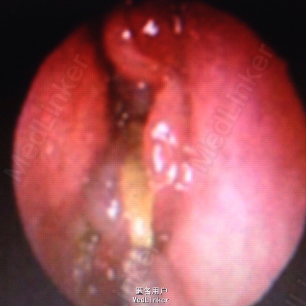 诊断:变应性真菌性鼻窦炎 治疗:完善术前相关检查后,口插管静脉复合麻醉下行鼻窦内镜手术,切除中鼻道息肉,开放上颌窦、额窦和全组筛窦,术中见各窦黏膜水肿,有息肉形成,额窦内伴有大量极黏稠黄褐色分泌物清除各窦息肉样变的黏膜及黄褐色黏稠分泌物,0.2%的氟康唑100ml冲洗窦腔。术后3 天0.2%的氟康唑10ml溶于100 ml生理盐水冲洗鼻腔。雷诺考特喷鼻,2次/天,术后口服泼尼松40mg/d,每周减10mg,连续4周递减至症状好转。