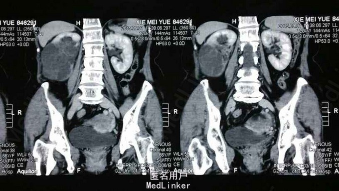 查体:双侧肾区无膨隆,双侧肾区无叩压痛,未触及肿块;右侧腰部可见陈旧性手术疤痕。肾功能检查提示左肾血流灌注正常,右肾血流灌注减低;右肾功能中度受损,总肾功能轻度受损,左肾不完全代偿。CT提示右肾下极前部见8.5x11x12cm类圆形不均匀低密度肿物,内见多发分房状囊样低密度影及不规则斑片组织状软组织密度影,增强扫面无明显强化,右肾多发囊性肾癌与多发囊性肾瘤鉴别。