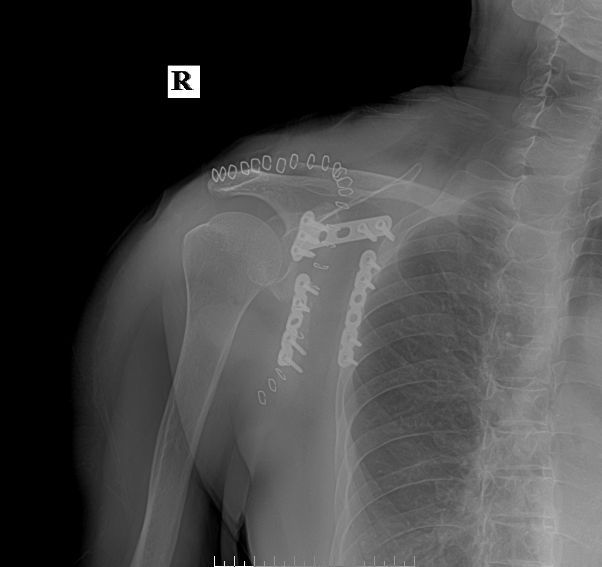 主 诉:摔伤右肩部疼痛活动受限1天。现病史:1天前摔倒致伤右肩部,即感右肩部疼痛、活动受限。当时无昏迷及呕吐。被家人送入郑州市第一人民医院诊治,经检查拍片诊为“右肩胛骨粉碎骨折”,未做特殊处理。为进一步治疗,今来我院求治。门诊经检查后以“右肩胛骨粉碎骨折”为诊断收入我科。发病以来,神志清楚,精神尚可,无恶寒发热,饮食、大小便正常,睡眠可,体重无明显变化。既往史:既往体健。无肝炎、结核等传染病史,无“高血压病、冠心病、糖尿病、脑梗塞”病史,无其它外伤、手术史,无输血、中毒史,无明确食物及药物过敏史,随社会预防接种。