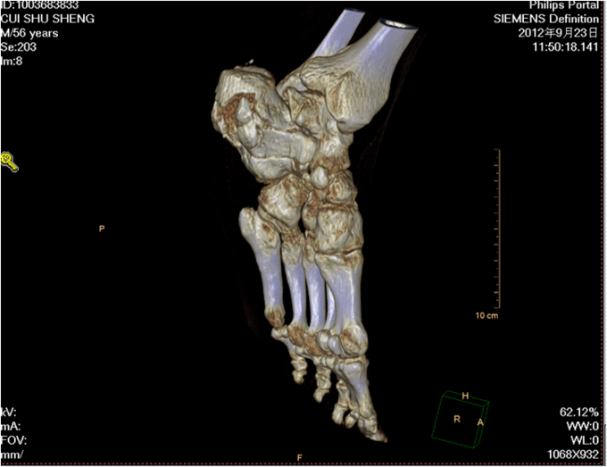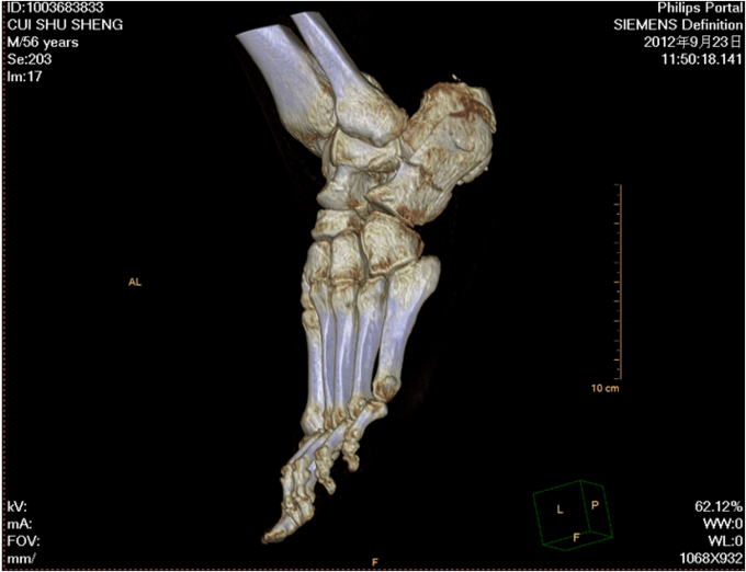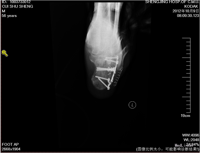 术后复查X线片示骨折复位良好,内固定在位且牢靠。根据骨伤科三期辨证理论,早期因瘀血停滞影响骨痂生长,故以活血化瘀,消肿止痛为主,应用桃红四物汤。术后证属肝肾亏虚,气血不足,治以补益肝肾,补气养血,应用愈骨胶囊等药物促进骨折愈合。术后嘱患者继续石膏托外固定,注意陪护,3月内扶双拐、按指导患肢不负重功能锻炼;休息3个月,加强营养,促进骨折愈合;继续中药应用,促进骨折愈合;定期复查,(1月、3月、6月);不适随诊。 本病例中医药应用结合手术复位,早期将骨折复位,中医药早期应用活血化瘀、消肿止痛,可迅速缓解患者症状。中医药中后期应用可促进骨折愈合,加快术后恢复,可使患者获得满意的术后疗效。