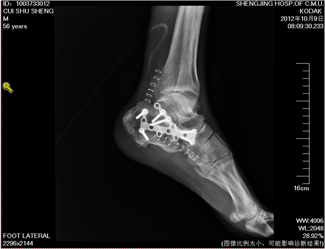 主 诉:摔伤左足跟部疼痛活动受限1小时。现病史:1小时前在自家干活时不慎从2米高梯子上摔下,当时患者意识清醒,无法站立,左踝部疼痛、肿胀、活动受限;被急送往中国医科大学附属盛京医院,经急诊医师会诊后,建议住院治疗,患者及其家属今为进一步治疗,要求入院,我科以“左踝部骨折”为诊断收入我科;患者伤来无发热、无头晕、恶心呕吐,无呼吸困难,既往饮食睡眠可,大小便正常;