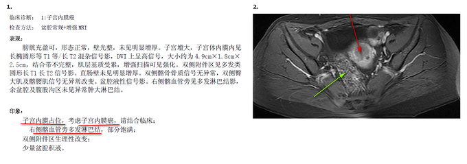1、盆腔常规+增强MRI :膀胱充盈可,形态正常,壁光整,未见明显增厚。子宫增大,子宫体内膜内见长椭圆形等T1等/长T2混杂信号影,DWI上呈高信号,大小约为4.9cm×1.8cm×2.5cm,结合带不完整,肌层基质受累,增强扫描可见强化。双侧附件区见多发类圆形长T1长T2信号影。直肠壁未见明显增厚。双侧髂骨骨质信号无异常,双侧臀大肌及髂腰肌信号无异常改变。盆腔液性信号影。右侧髂血管旁见多发淋巴结影,余盆腔及腹股沟区未见异常肿大淋巴结