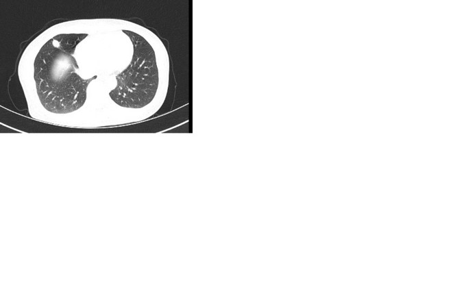 辅助检查:2015.7.31胸部CT(196593):右肺中叶炎症,右肺上叶多发肺大泡。2015.9.10胸部CT(200837):右肺中叶高密度灶,建议增强扫描;右肺上叶肺大泡。2015.9.16胸部增强CT:右肺中叶外侧段结节,恶性不除外,建议随访复查。右上肺肺气囊。右侧第5肋骨致密影。附见:肝脏膈面海绵状血管瘤考虑;肝脏囊肿。2015.9.11血常规:未见明显异常。入院后检查:09月19日心电图:窦性心律;正常范围心电图。09月19日超声:心脏:三尖瓣轻度返流,右侧甲状腺结节伴钙化,双侧颈动脉局部内膜增厚伴左侧斑块。09月19日 总IgE测定+降钙素原定量检测:免疫球蛋白E104.90IU/ml。09月19日 甲功全套+肿瘤系列(女7项)+生化分析(病房):肌酸激酶184IU/L,乳酸脱氢酶316IU/L,血管紧张素转化酶10IU/L,胆固醇6.15mmol/L,抗甲状腺球蛋白抗体77.76U/ml,铁蛋白304.0ng/ml,同型半胱氨酸17.97μmol/L,肾小球滤过率估值1121.17ml/(min*1.73m^2。09月21日 尿常规:尿潜血2+,结晶+个/LP,白细胞酶1+。09月19日 BNP、血液常规/HCRP、结核杆菌抗体、红细胞沉降率测定ESR、活化CD4细胞+活化CD8细胞+淋巴细胞亚群(T/B/NK、血流变、血凝/D二聚体、肿瘤系列(6项)、大便常规隐血、过敏源/IgE、呼吸道核酸检测、抗核抗体测定(ANA)+ENA谱+ANCA、荧光法病原体抗体:未见异常。09月22日咽拭子一般细菌/真菌/嗜血菌:未培养出嗜血杆菌,正常菌群,未培养出真菌。09月23日痰结核菌涂片:未找到抗酸杆菌。09月24日痰一般细菌/真菌/嗜血菌:未培养出真菌,未培养出嗜血杆菌,正常菌群。09月23日气管镜各级支气管通畅,刷片:(气管镜刷片)未见肿瘤细胞。灌洗液抗酸杆菌阴性,09月23日针吸涂片:(收到针吸涂片)未见肿瘤细胞。09月25日右肺结节:(右肺穿刺活检组织)肉芽肿性炎,倾向结核。