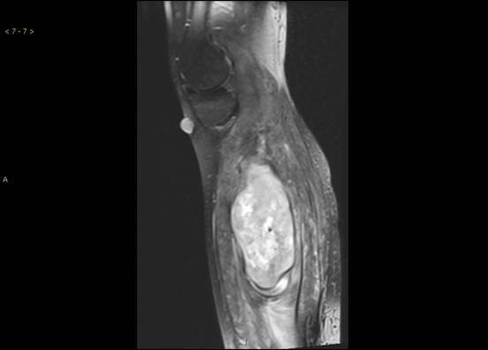 专科检查骨科情况右小腿后侧可触及8cm*3cm大小实性肿物,质中,可移动,边界不清,压痛。局部皮肤无溃破糜烂,皮温正常。左下肢感觉无异常,肌力、肌张力正常。 MRI:左侧小腿巨大软组织肿块,考虑肿瘤性病变,低度恶性可能性大,伴左侧腓骨受压变形。建议活检。