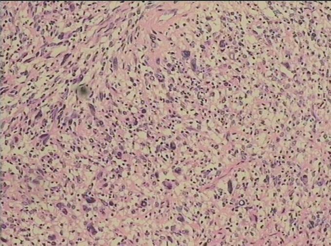 随访:术后随访中。 讨论:肿瘤位于深部组织,无明显自觉症状或稍有不适感,生长缓慢。肿瘤的大小与病程长短有关,直径从数厘米到十几厘米。肿瘤周界不清,表面光滑,无压痛,质坚韧如橡皮。与侵犯肌肉的纵向较固定,而横向稍能移动,与皮肤无粘连。巨大肿瘤可影响活动和压迫神经。