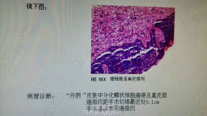 外阴小块组织活检提示:中分化鳞状细胞癌。完善相关检查后,全麻下行外阴局部病灶切除,术后常规抗炎对症治疗。术后病理提示外阴中分化鳞癌侵及真皮层。