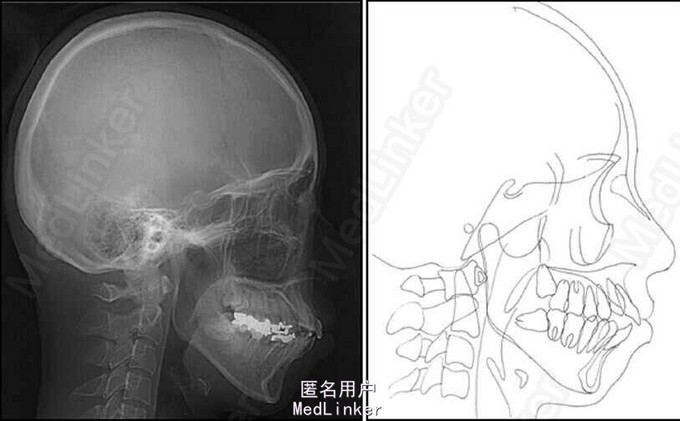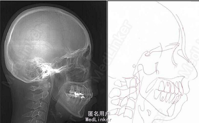 面部:凸面型,上下唇前突,上唇E线前3.5mm,下唇E线前9.5mm,闭唇时口周肌肉紧张。口内检查:双侧尖牙磨牙I类关系,左侧7锁合,覆盖4.5mm,覆合1mm,中线正,上颌拥挤度12.5mm,下颌拥挤度8.2mm。全景片示4个第三磨牙均阻生,怀疑上颌第二磨牙远中面因8阻生有牙根吸收,下颌8近中倾斜阻生更严重,右下6、左下4和5都行了RCT并大面积充填。头影测量示骨性I类,高角,下切牙唇倾。无TMJ症状,只是咀嚼测试时,右侧(非锁合侧)较左侧速度更快且更稳定。
