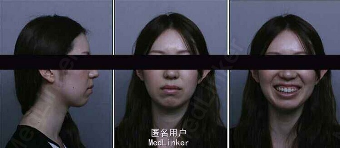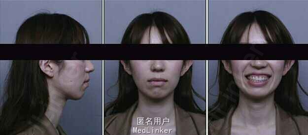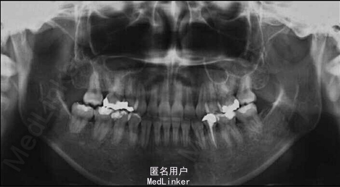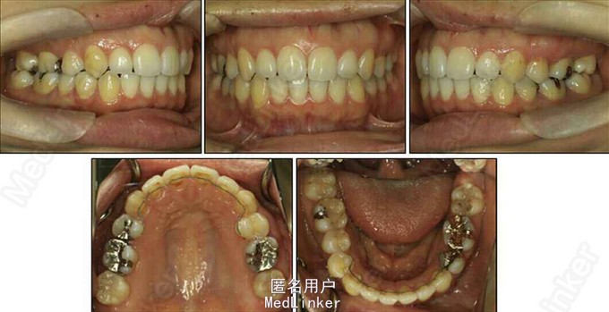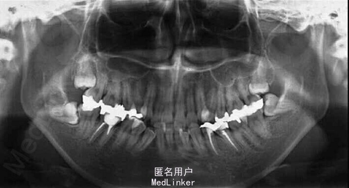 诊断:安氏II类1分类,双颌前突,牙列严重拥挤,左下7锁合,双侧上7牙根吸收,四颗第三磨牙阻生 治疗目标:减少唇的突度及前牙拥挤,扶正4颗阻生的第三磨牙,达到良好的面部美观和功能咬合。 治疗:上颌拔除2颗5和2颗7(不拔4的原因为左上4为正常牙,左上5大面积充填;右上4形态较右上5好。因拔除了坏牙保留了健康牙齿,但是拔5不利于前牙的内收,所以于上后牙56之间植入了支抗钉加强支抗,辅助内收前牙。拔7原因为两颗7远中面均有牙根吸收且有大面积充填),下颌左侧拔除5和7(左下5根管治疗且根尖阴影,拔除左下7原因为严重锁合,改正困难且容易导致上下磨牙的伸长加重II类高角面型),右侧拔除根管治疗且大面积充填后的6;分别竖直4颗近中倾斜阻生的8,整个疗程39个月,四颗8成功的代替6或7。双侧I类尖牙关系,左侧磨牙I类关系,右侧磨牙完全远中关系。唇突度改善,全景片可见达到可接受的牙根平行度,4个8完全萌出直立。以前因为锁合导致的两侧咬合不对称没有了。