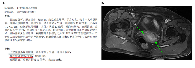 1、B超:内膜厚0.5cm,子宫多发肌瘤,较大者1.5*1.4cm,宫腔下段至宫颈管内见低回声,约1.9*1.9*2.8cm,请结合临床除外占位病变; 2、诊刮术,病理回报:低分化癌,符合透明细胞癌; 3、盆腔MRI:子宫内膜不规则增厚,结合带显示欠清,宫底部短T2结节影,肌瘤可能,宫颈饱满,后壁片状长T2信号。