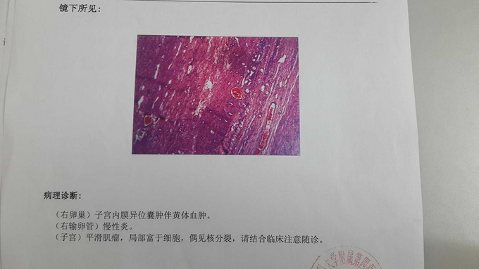 诊断:盆腔肿物。与患者沟通病情,给与行剖腹探查术,术中见右侧卵巢巧囊,与宫体及周围肠管粘连致密。行患侧附件切除术,及盆腔粘连松解术。