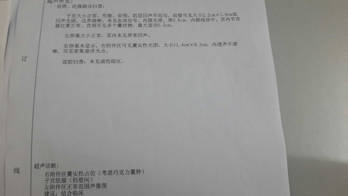 妇科查体:外阴发育良好,阴道通畅,无异常分泌物,宫颈光滑柱状,宫体前位,表面光滑,宫体右侧前方可触及一囊实性包块,边界不清,张力大,有压痛,余未触及明显异常。入院后CA125测定结果是45.29U/ml ,其余化验正常。