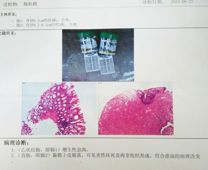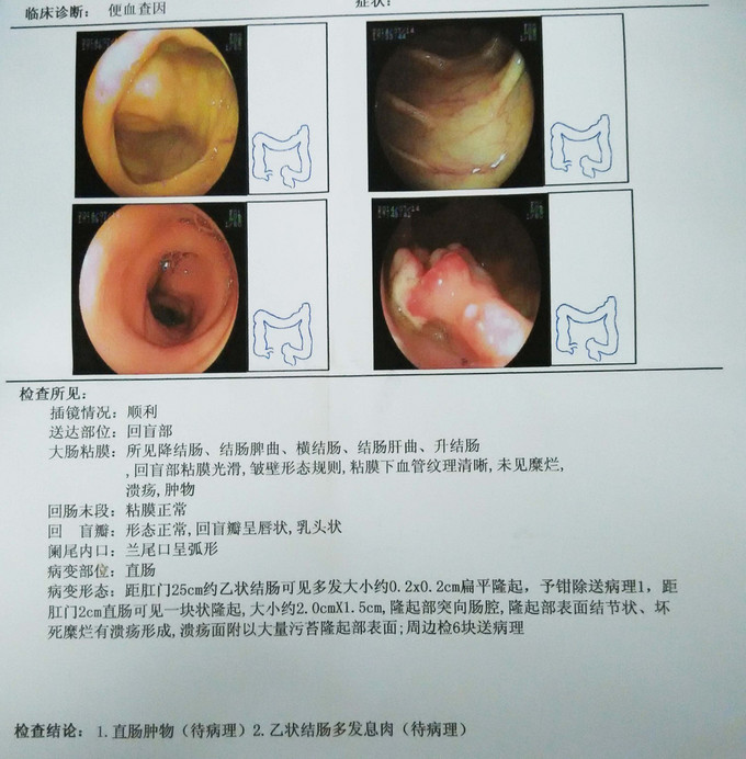 患者青年女性,因“反复便血10余年,加重1月余”入院。 患者于10余年前无明显诱因开始出现便血,为便后滴出,鲜红色,量约1-2ml,进食煎炸或辛辣食物后便血可加重,无伴粘液脓血便,无伴果酱样大便,无腹痛、腹泻,无恶心、呕吐,无反酸、嗳气,无胸闷、心悸、气促,无头晕、头痛、眼花,无乏力、出冷汗,无呕血、呕吐咖啡样物,患者未予重视,症状反复发作。1月余前患者便血加重,次数及量较前增多,伴有排便不尽感,无伴里急后重,遂于2015-09-23至我院门诊就诊,行电子胃肠镜示:1、慢性浅表性胃炎伴糜烂、胆汁反流 2、胃体息肉(已钳除,待病理) 3、直肠肿物(待病理) 4、乙状结肠多发息肉(待病理)。超声肠镜示:直肠病变符合直肠CA声像。现患者为进一步诊治,门诊拟“便血查因”收入我科。自起病以来,患者精神、睡眠、胃纳可,大便如前所述,小便正常,体重无明显变化。