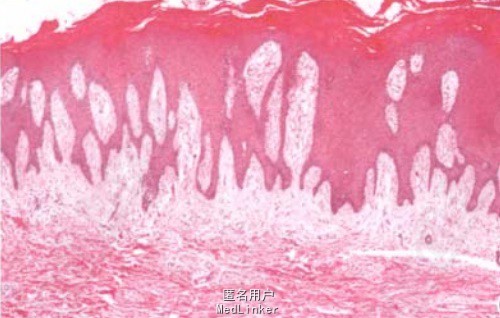 皮肤科检查:双掌跖部可见浸润性红斑块,厚积痂屑,部分延及足背,界限清楚,双足干燥、皲裂,未发现明显水疱或脓疱,多数痂屑为粘着性,在与正常皮肤交界处部分皮损Auspim征阳性。趾甲均呈灰黄色,可见明显增厚、剥蚀。头皮、肘膝、躯干等部位均未发现类似皮损。趾甲及皮损刮屑真菌涂片及培养均阴性。皮损组织病理检查:融合性角化过度伴角化不全,角质层内灶性中性粒细胞聚集。表皮呈假上皮瘤样增生,增宽延长的上皮脚大致位于同一水平,且互相吻合。真皮毛细血管扩张迂曲,直达顶部。