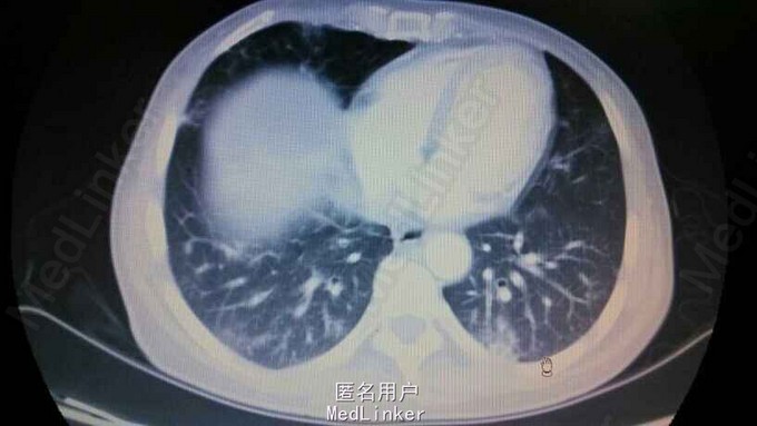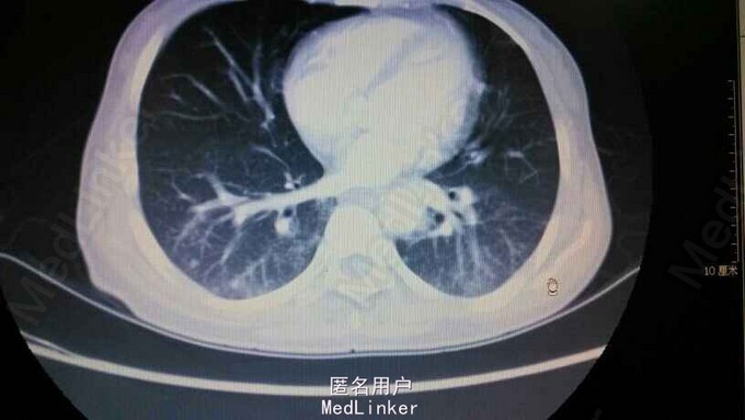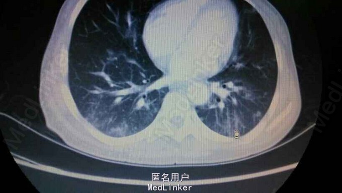 双肺呼吸音粗,双肺底闻及湿罗音。余无特殊。血象不高。抗肺炎支原体抗体阳性,滴度1:1280,后复查1:2560。支气管镜未见明显异常。胸部CT示双肺感染性病变