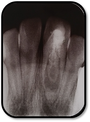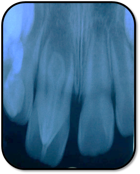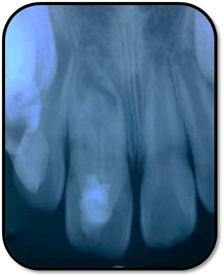 检查: 右上1牙冠略宽大,舌侧见粗大的畸形舌尖,叩痛(++),松Ⅰ°,唇侧牙龈红肿前庭沟膨隆扪痛,挤压唇侧龈缘溢脓,冷热测无反应,右侧上下1侧方颌,正中颌颌创伤。 X线:右上1发育7-8期,根管平行状,根尖孔宽大,约5-6mm宽,根尖周低密度影。髓腔根管宽大内见倒置牙影像,倒置牙可见髓腔。 余牙未见异常 6均已萌出建颌
