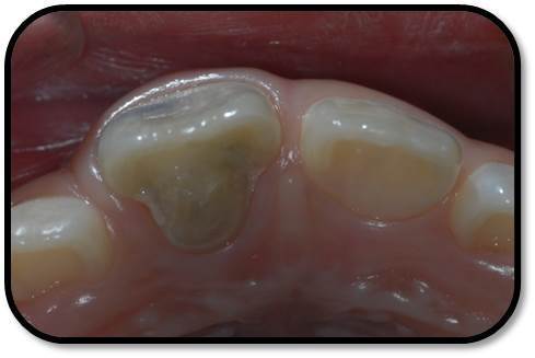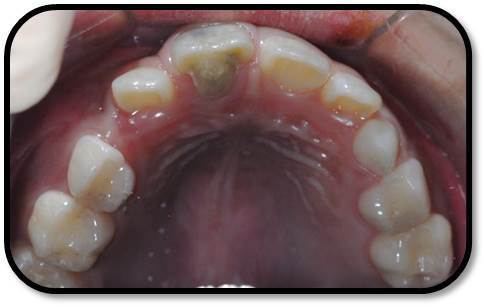 儿童7岁半,男 主诉:右上前牙自发痛,咬合痛3天。 现病史:患儿右上前牙自发痛,咬合痛3天,牙龈肿痛1天,今来诊求治。否认前牙外伤史。 既往史,家族史:无特殊 全身情况:健康