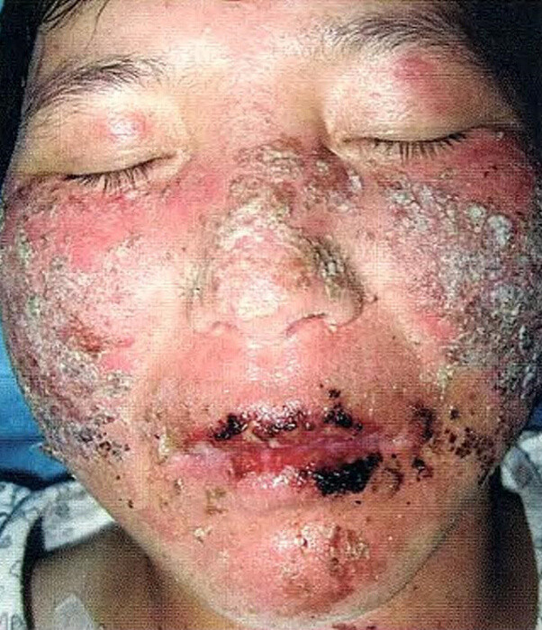 诊断:药物性红斑狼疮。 治疗:立即停服可疑致敏药物,给予甲泼尼龙40mg/d静脉滴注抗炎、抗免疫治疗,并辅以护胃、抑酸、保肝、补钙、补钾、止痒等对症治疗。 治疗1周后患者皮疹明显好转,水疱全部干涸,口腔溃疡消退,关节肌肉疼痛亦缓解。