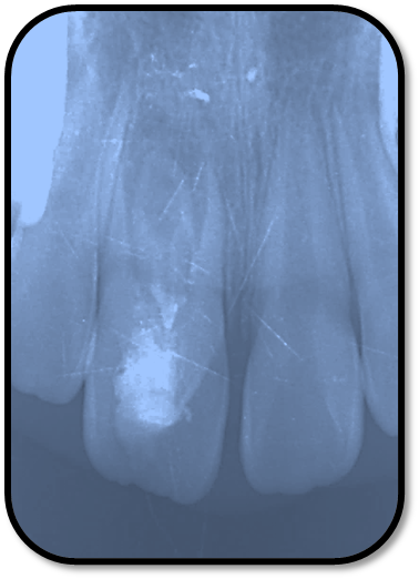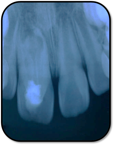 检查: 右上1牙冠略宽大,舌侧见粗大的畸形舌尖,叩痛(++),松Ⅰ°,唇侧牙龈红肿前庭沟膨隆扪痛,挤压唇侧龈缘溢脓,冷热测无反应,右侧上下1侧方颌,正中颌颌创伤。 X线:右上1发育7-8期,根管平行状,根尖孔宽大,约5-6mm宽,根尖周低密度影。髓腔根管宽大内见倒置牙影像,倒置牙可见髓腔。 余牙未见异常 6均已萌出建颌