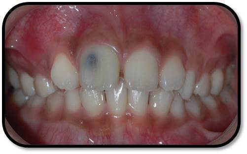 儿童7岁半,男 主诉:右上前牙自发痛,咬合痛3天。 现病史:患儿右上前牙自发痛,咬合痛3天,牙龈肿痛1天,今来诊求治。否认前牙外伤史。 既往史,家族史:无特殊 全身情况:健康