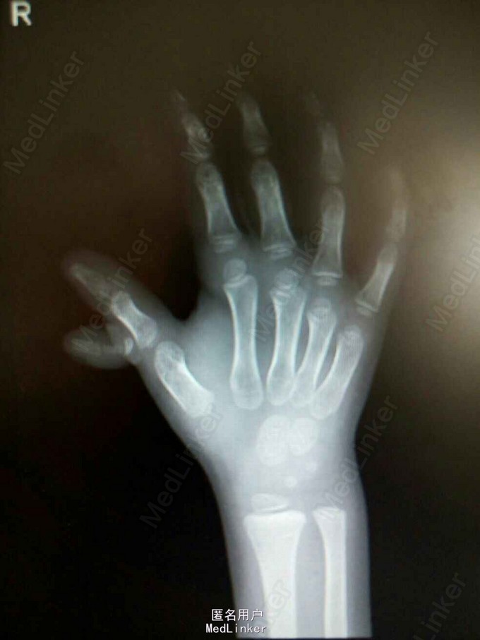 查体:右手拇指多指畸形,自右手拇指近节中部,向外侧生发出一拇指节,活动可,未触及粘连,触之无压痛,表面皮肤未见明显红肿。辅助检查:右手正斜位X光检查提示:右侧拇指多指畸形,与正常拇指无骨性连接,余右手各掌骨、指骨、腕骨形态以及骨质未见异常。各指间关节、掌指关节以及腕关节结构关系正常,关节面光滑,关节间隙无变窄。
