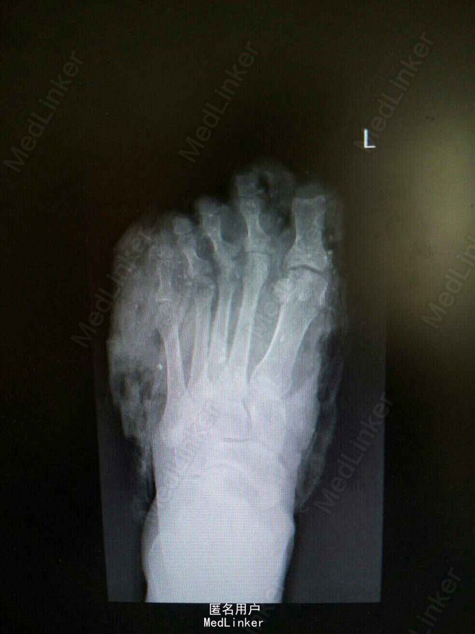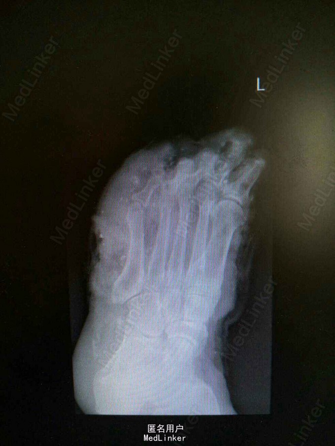 诊断:左足碾压伤:第1-4趾远节缺损,第二跖骨基底部撕脱性骨折。 处理:急诊行左足清创+撕脱皮肤回植+第1-5趾截趾术+趾神经探查+足背动脉探查术,患者情况稳定后再次行左足清创,残端修整+VSD负压吸引术,而后行左足创面植皮。