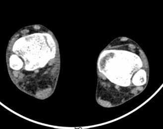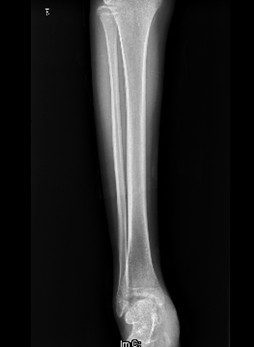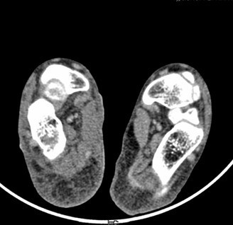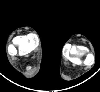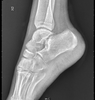 查体:右足内踝、外踝及跟部皮肤变暗,部分缺血坏死。未见畸形,稍肿胀。右足趾皮温无明显降低,右足趾感觉未见明显异常。右足内踝、外踝及跟部皮肤局部压痛。右踝关节活动受限,右踝关节活动诱发疼痛。右膝关节活动未见明显异常。 辅查:x片示右跟骨,右胫骨远端骨折。