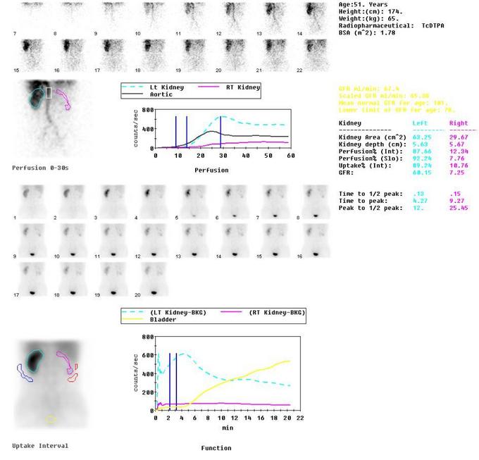查体:右肾区明显压痛及叩击痛,左肾区无叩痛。右输尿管区轻微压痛,左输尿管区无压痛。膀胱区无明显隆起,未及包块,无压痛,叩诊无浊音。 辅查:我院泌尿系平扫CT+三维重建检查提示:右输尿管上段多发结石,右肾及输尿管重度积水,右肾萎缩。左肾盂略宽,结合临床。 我院肾图检查提示:1.右肾符合积水改变,功能重度受损。2.左肾GFR正常范围,功能正常。