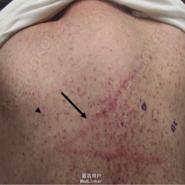 查体:背部皮肤可见大量红色斑丘疹,大小2-5mm,受累部位皮肤Darier征阳性(图2)。 辅助检查:皮肤活检提示肥大细胞增生,类胰蛋白酶升高,骨髓活检证实为系统性肥大细胞增多症。