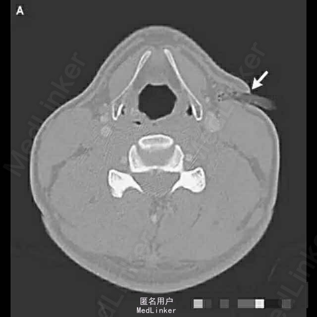 CT未有伤及血管或气管的证据。穿透性颈部伤可导致血管、气管、颈椎或神经的损伤。如果患者出现大血管损伤,刺入的异物可起到填塞的作用。因此,在进行放射学检查或手术探查之前,保持异物原来的位置可能有一定获益。N Engl J Med. 2015 Jul 23;373(4):366. doi: 10.1056/NEJMicm1412571. No abstract available.