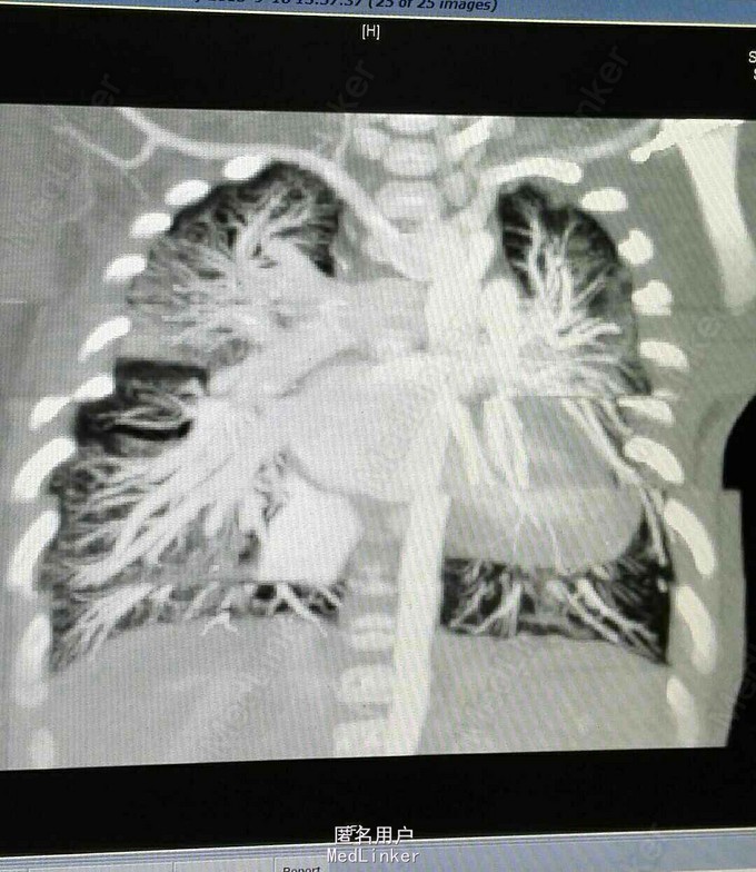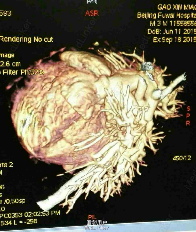 查体 生命体征平稳,双肺呼吸音清,未闻及干湿性罗音,心率规整,于胸骨左缘第二肋间可闻及3/6期收缩期杂音,腹部平软无压痛反跳痛,双下肢无水肿。 辅助检查 心脏彩超示 先天性心脏病 右肺动脉起源于主动脉 动脉导管未闭 三尖瓣反流 肺动脉高压。 心脏CT 先天性心脏病 右肺动脉起源于主动脉 动脉导管未闭 肺动脉高压