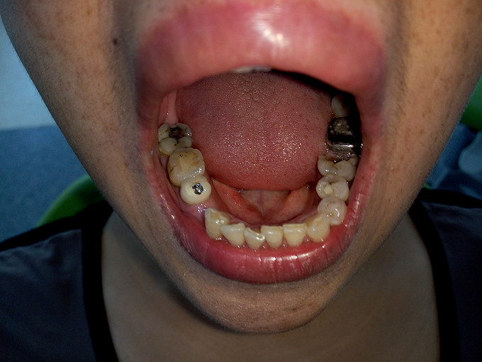检查如图,36残冠,已露髓,远中缺损至牙龈缘下,Ⅰ°松动,探(-)叩(-)冷(-);44缺失,45rct术后,牙合面树脂充填物,47牙合面大面积龋坏;37金属全冠,牙合面已磨穿,探(-)叩(-)冷(-),冲洗可见食物残渣。
