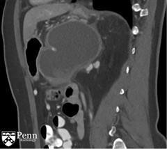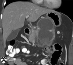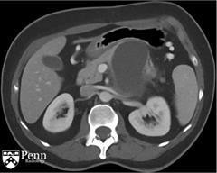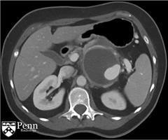 于胰体/尾部的巨大的分叶状的囊性肿块,包绕脾动脉。其内可见一致密物在病变的内部下方与其分层。脾静脉内形成血栓,导致明显的胃肝和胃脾静脉曲张。见一假性动脉瘤起源于脾静脉的分支。