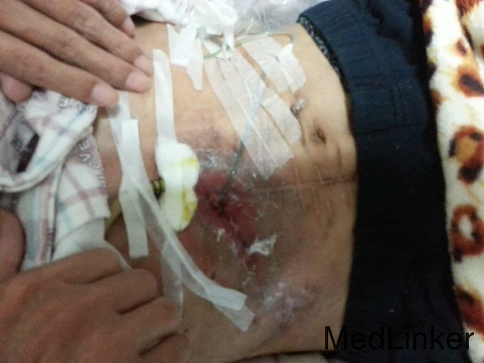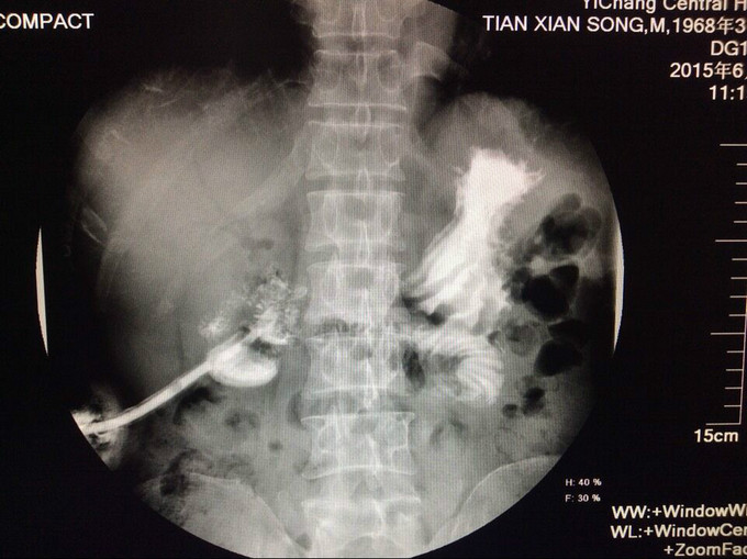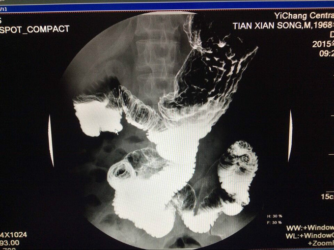 主诉:方向盘伤,胰头十二指肠破裂,肝十二指肠韧带撕裂伤术后8月,复杂肠漏1例。 2.现病史:患者因8月前因腹部外伤,当地医院行剖腹探查术,术中发现胆管、胰管、十二指肠损伤,肠系膜上静脉撕裂,行胰十二指肠切除,胰肠+胆肠+胃空肠Y吻合。术后出现重度感染休克、外伤性胰腺炎,予以腹腔引流术+空肠造瘘置营养管术,行抗休克、抗炎治疗,现术后8月腹腔引流管持续引流出胆汁及肠液,经引流管造影可见造影剂流入肠管,行上消化道造影未提示胃及肠管穿孔。
