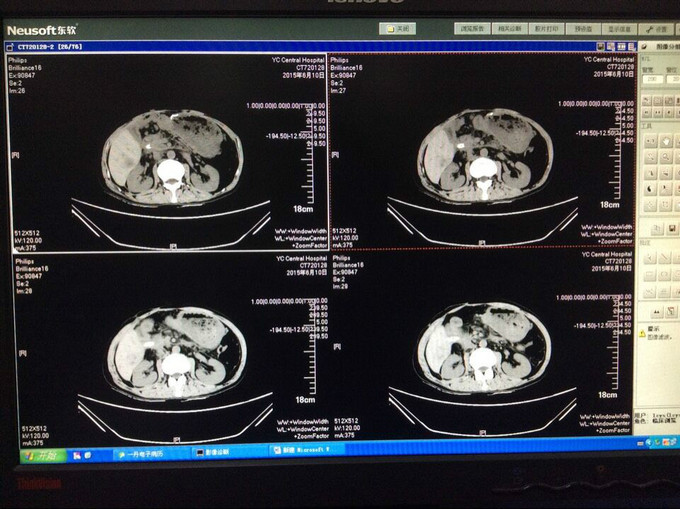 入院查血: Blood-Rt(五分类): 白细胞 6.97*10^9/L,红细胞 3.84*10^12/L,血红蛋白 122 g/L,红细胞压积 37.3 %,血沉 42 mm/h 查体:无特殊异常,腹腔引流管偶有黄褐色浑浊液体流出,量约50-80ml,腹软,无压痛、反跳痛,二便正常。 辅检:上腹部CT提示:胆肠吻合口一直径约2cm结石 辅助检查见上图