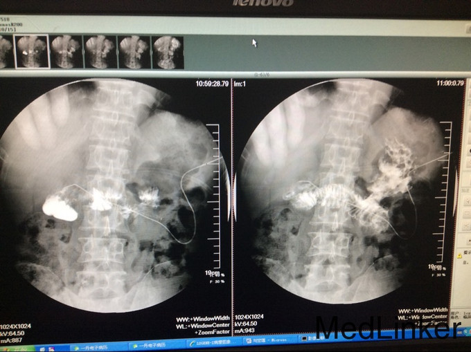 漏口位置,依据上消化道钡餐造影未见消化道穿孔,而从腹腔引流管处注入碘水造影可见肠管及隐约胃形显示,估计漏口位置为胰腺空肠及胆管吻合处肠管漏口, CT提示:胆道结石,尝试拔管后漏口无法愈合,再次予以腹腔引流置管。 我们分析漏口无法愈合的原因为胰液及胆汁对自身组织的消化,术中胆肠吻合口处放置T管,及胰腺空肠段放置引流管,引流肠液,目的为减轻消化液对漏口的影响,术后原漏口愈合,但出现新唇状漏,采用T管经皮下隧道引流 ,原皮肤漏口缝闭,同时加用负压吸引。 讨论2点: 1.该病人初次少量胆漏合并胆道结石时是否需要手术治疗? 2.再次出现唇状漏时,患者消化液外漏引起局部皮炎,皮肤伤口周围组织腐蚀严重,采用T管经皮下隧道引流,能否起到良好的治疗效果?