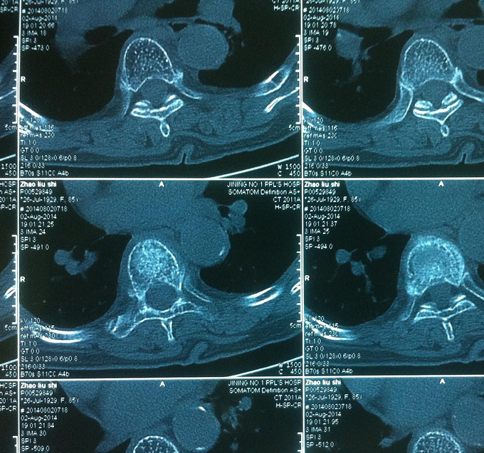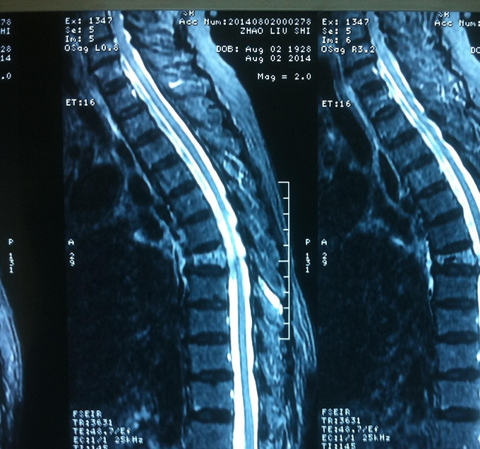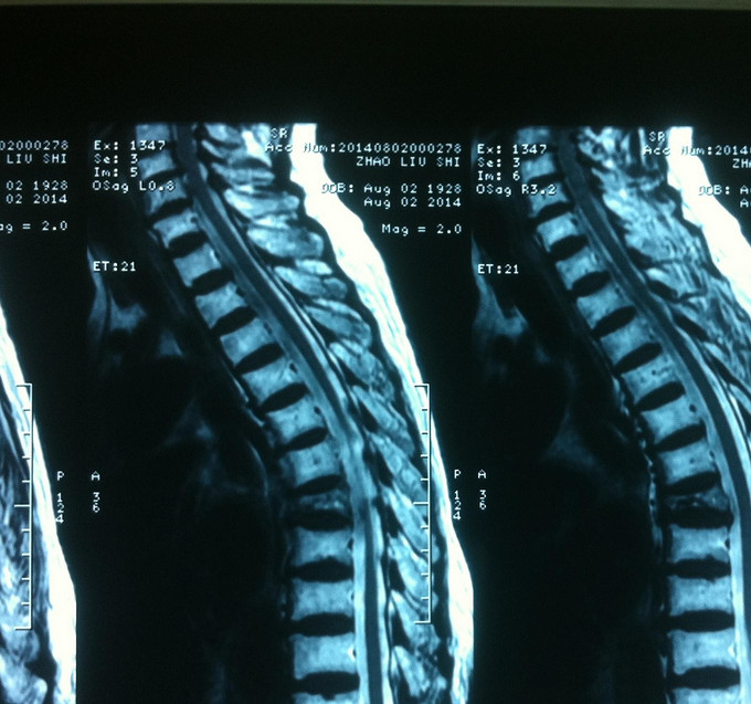 专科查体:背部后凸畸形,背部叩痛,腰骶部无叩痛,双下肢感觉无减退,双下肢肌力4-5级,双侧膝腱反射++,巴氏征阴性。影像学检查:X-Ray;骨质疏松、胸8楔形变。MR:胸8压缩性骨折,新鲜。