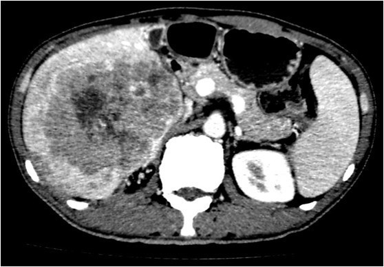 现病史:男,39岁,因“上腹不适1月”入院,患者因上腹部不适1月,到当地医院就诊发现肝内占位,AFP显著升高,诊断为肝细胞癌,为进一步诊治入我院。 既往史:乙肝病史10余年;父亲有乙肝病史,舅舅患有肝细胞癌