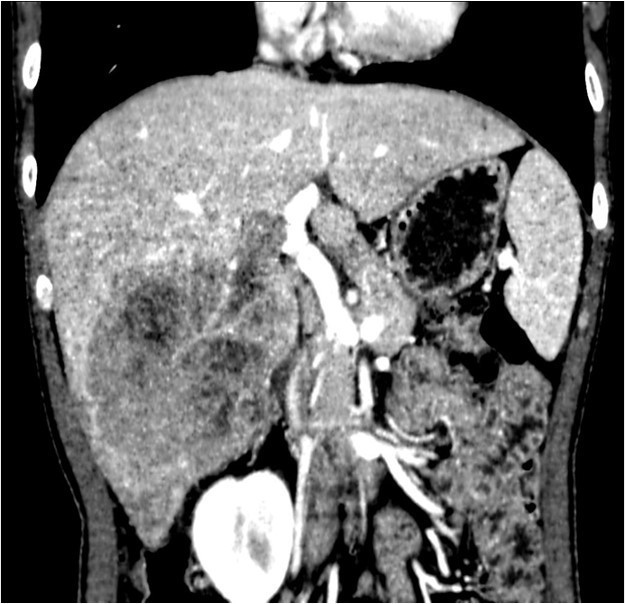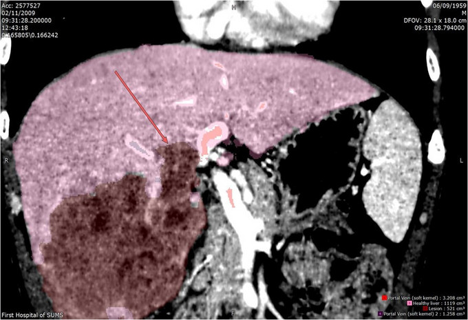 体查:未见阳性体征 实验室检查: WBC 7.24× 109/L, N 48.1%, Hb 159g/L, PLT 117× 109 /L ,PT 12.5s ; HBsAg+, HBcAb+,HBeAg+;HBV-DNA5.33× 106 IU/mL ALT 240 U/L, AST 154 U/L, ALB 36.9g/L, TBIL 13.1umol/L AFP 6270 ug/L ICG 15分钟滞留率 4.5%;Child-Pugh A级 CT提示肝S5、S6肝细胞癌并门静脉右支癌栓形成