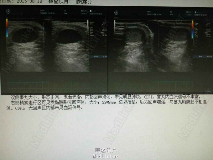 查体:站立位时于右侧腹股沟近阴囊上方处可见一包块,直径约2.0cm大小,呈卵圆形,触之柔软,无压痛;卧位时缩小或消失。阴茎呈男童外观,包皮过长,双侧阴囊、睾丸、附睾及精索未见异常。 辅查:2015-8-18我院阴囊彩超提示:右侧精索鞘膜积液。
