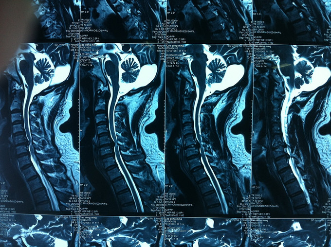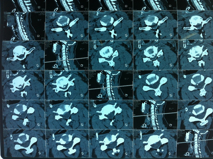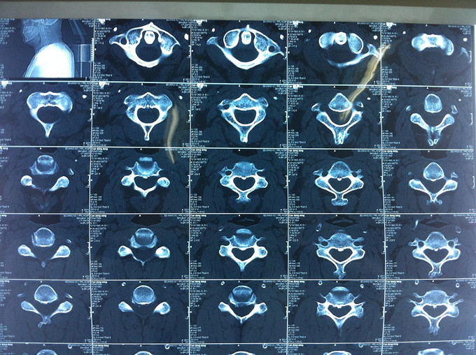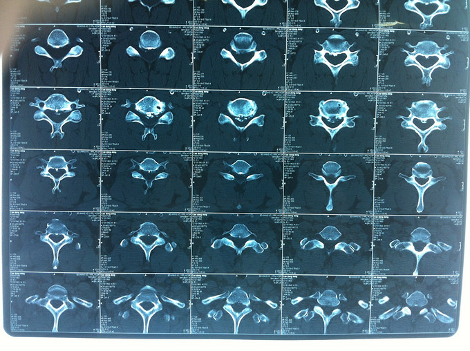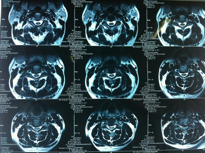 查体:颈后部压痛,颈部活动受限,双侧前臂及手感觉减退,双侧伸腕、伸肘肌肌力4级,双侧霍夫曼综合征阴性,双下肢感觉无减退,双下肢肌张力高,巴氏征可疑阳性,辅助检查: X-ray:劲椎退行性变 CT:颈椎间盘突出,腰5/6 MR:颈椎间盘突出,颈5/6节段明显