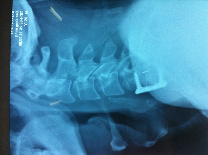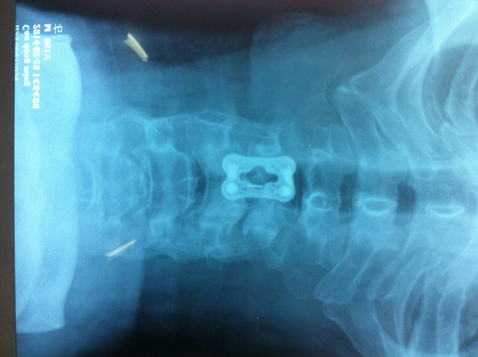 随访 1、术后患者颈部疼痛较前减轻,双侧上肢疼痛、麻木感觉较前好转,双侧伸肘、伸腕肌肌力4+级。 3、术后1个月,患者上肢麻木明显好转,左侧伸腕、伸肘肌肌力4-5级。 讨论:1、颈椎病手术指证的把握,牵引药物保守治疗与手术减压的选择? 2、颈椎手术前路与后路的手术选择?是否考虑以下问题:1、神经根型与脊髓型;2、是否合并椎管狭窄;3、是单双节段还是多节段间盘突出;4、颈椎前路单间隙还是椎体次全切