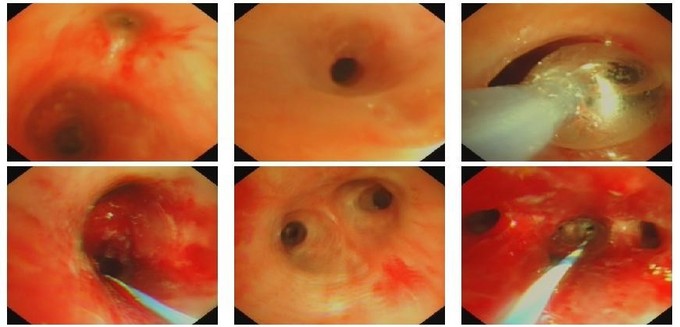结婚患者外院胸部CT资料,诊断考虑患者为支气管内膜结核所致右肺多发支气管狭窄。入院后行首次纤支镜检查,见“右主支气管开口重度瘢痕性狭窄,估测直径约3mm,外径4.5mm内镜不能窥入”,遂于该处行5841球囊扩张术,术后管腔较前明显扩大,估测直径约7mm,见右上叶各叶段管腔通畅,右中间段及右中下叶支气管呈轻度瘢痕性狭窄,表面黏膜充血,少许分泌物,遂予冲洗并留取标本送检病原学检查。标本未察见结核菌。时隔一周后再行纤支镜探查,术中见“右主支气管开口中度瘢痕性狭窄,估测直径约5mm,外径4.9mm内镜可顺利窥入”,再次于该处行5841球囊扩张术,术后管腔较前明显扩大,估测直径约9mm,见右上叶各叶段管腔通畅,右中间段及右中下叶支气管呈轻度瘢痕性狭窄,表面黏膜充血,遂予右中叶开口行扩张,并逐次扩张右中叶,右下叶各段支气管,术后管腔较前明显扩大。术后入病房于静脉左氧沙星抗感染治疗。两周后行第三次复查,见“右主支气管开口轻中度狭窄,黏膜充血,外径4.9mm纤支镜可顺利通过”。右上叶支气管管腔通畅,右中间支气管及右中下叶各段黏膜充血肿胀糜烂,开口轻度狭窄。患者自觉症状明显改善。