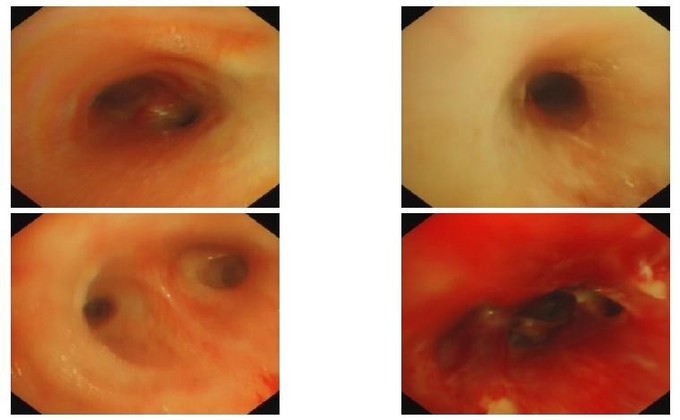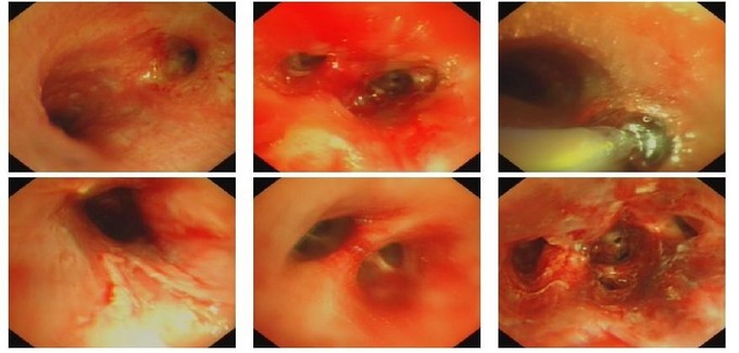 患者诊断气道多发狭窄明确。不过,以往所见到的大多数病例都是左侧主支气管,本例为右侧,是本人首次见到。同时有多个狭窄段。故治疗的时候采用了分期治疗的措施,避免一次操作时间过长,患者难以耐受。在第一次开通了右主支气管之后,患者的气促症状明显改善,为其后的治疗打下来良好的基础,所以第二次有了较为充裕的时间,逐个开通了多个小分支的狭窄。不过,在第三次复查的时候,仍然可见气道内有较多的分泌物,提示阻塞性炎症仍然较为明显,如患者不积极控制感染,可能在炎症刺激之下再次狭窄,故给予了积极地抗感染治疗,出院之后嘱其继续吸入普米克都保,目的是希望发挥其一定的气道抗炎作用,避免狭窄的再次发生。