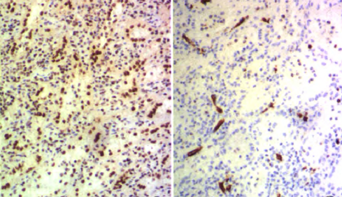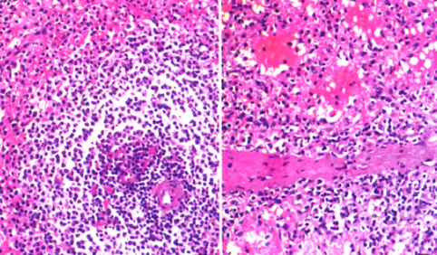 诊断:盆腔肿物,性质待查 治疗:行子宫全切除术。术后子宫性病理活检,子宫做多个切面,在肌层内查见2个大小不等灰白色肌瘤,肌瘤面积0.3cm×0.2cm—1cm×0.6 cm,肌瘤切面质韧,灰白色,呈编织状,边界清;内膜光滑,厚0.2—0.3 cm,肌层厚2.5—3.5 cm,部分呈海绵状,子宫颈光滑,切面质韧,质地较细。盆腔内不规则肿物1个,灰红色,表面结节状,11cm×7.5 cm×3.5 cm大小,做多个切面,切面见多个结节,结节面积:0.4 cm×0.3 cm~4.3 cm×2.5cm,结节切面质脆,灰红色,质地细,结节边界清。另送圆形结节5个,直径1~3 cm不等,切面性质同盆腔较大肿物,均有包膜。 镜检:患者子宫检查为子宫肌瘤,子宫腺肌病,病变无特殊性。盆腔多个肿物病变性质基本一致,为扩张血窦样组织,窦腔内充满红细胞,似脾红髓淤血,在血窦样组织间有大小不等、发育良莠不齐的白髓样结节,结节较大者有小中央动脉,结节较小者中央动脉不明显,内皮细胞无异型性,细胞分化均无异型性,无病理性分裂象。可见玻璃变性纤维结缔组织似脾小梁样结构。
