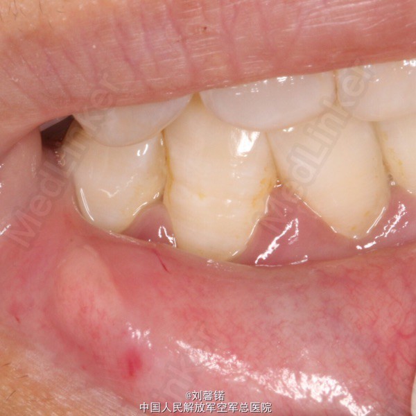 检查:右侧下唇近口角处一约花生米大小,呈半透明的无痛小疱,突出下唇表面,表面光滑,无蒂,挤压不可消失