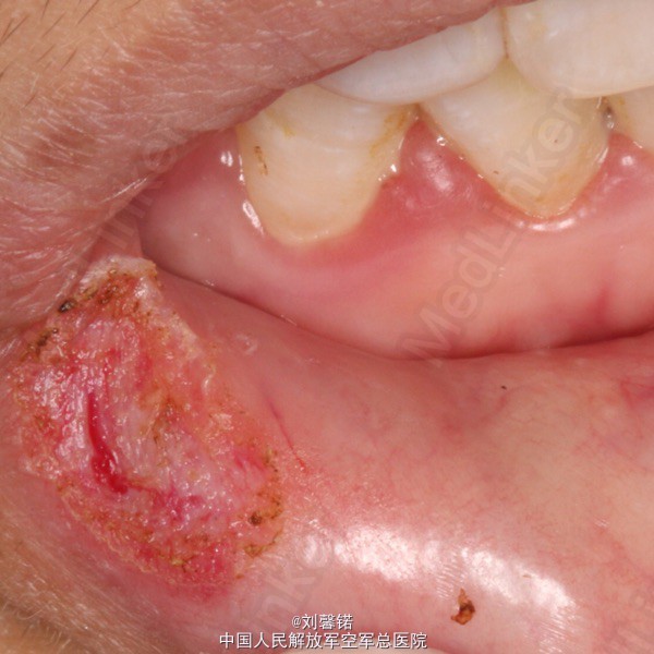 王某,男11岁 主诉:右侧下唇肿物半年余 现病史:半年来,右侧下唇近口角处一光亮“水泡”,肿胀消退,但不久又可复发,今日来我科要求治疗。